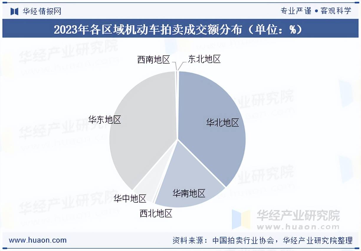 从机动车拍卖成交额区域分布来看,2023年各区域机动车拍卖市场份额各有起伏:华东地区机动车拍卖成交额110.22亿元,占全国38.11%份额,市场份额略有下降,仍是全国机动车拍卖市场重心所在;华北、华南、东北、西北地区实现小幅增长;华东、华中、西南等地区成交略有上升,但市场份额均有所下降。