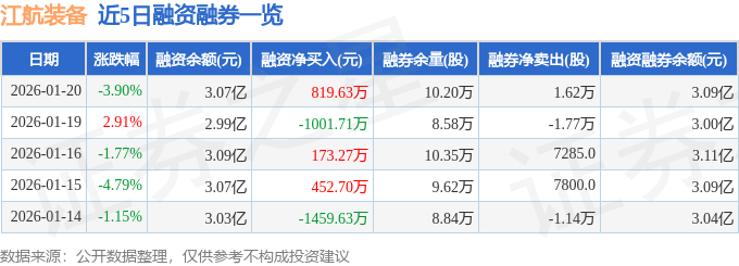 证券之星消息,截至2026年1月20日收盘,江航装备(688586)报收于14.28元,下跌3.9%,换手率2.36%,成交量18.71万手,成交额2.69亿元。